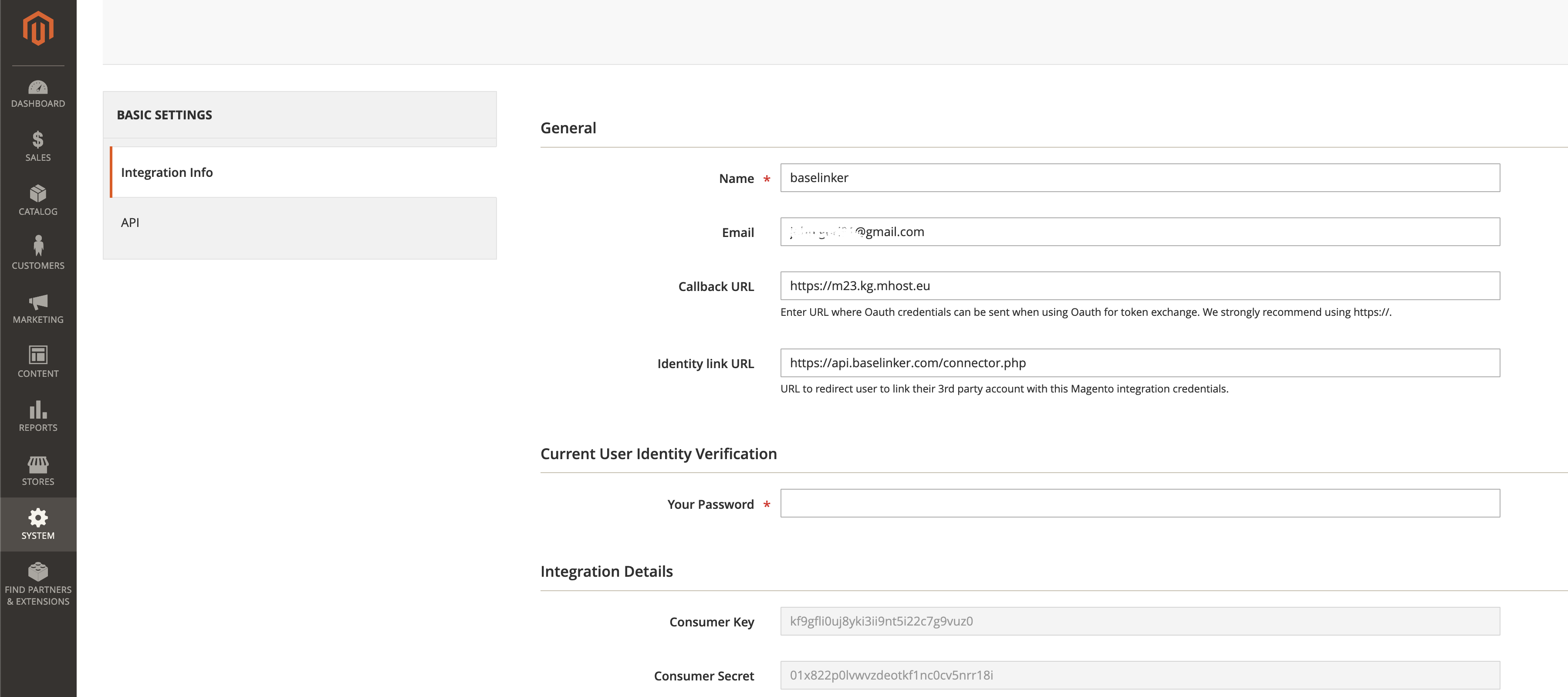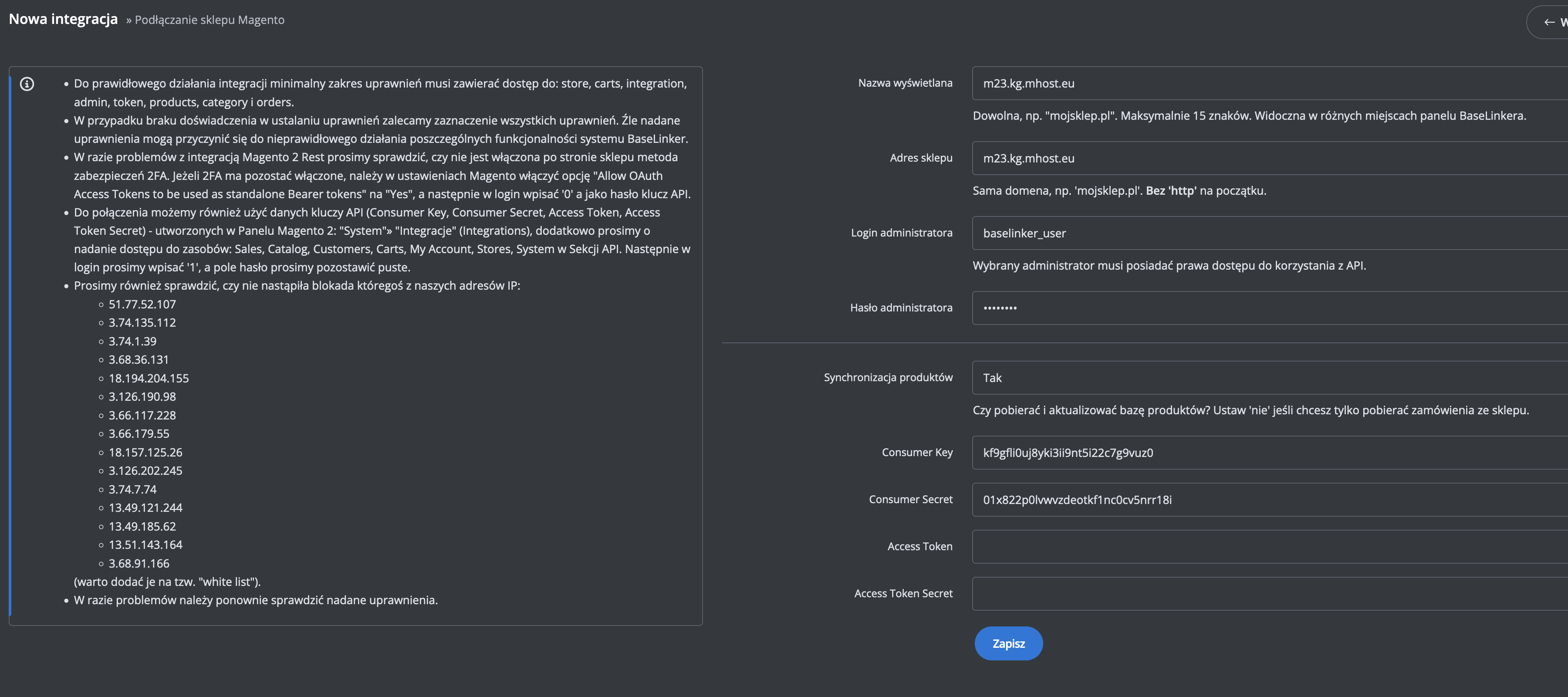 - Wprowadź dane dostępowe konta integracji z Magento 2, oraz wygenerowanie klucze: