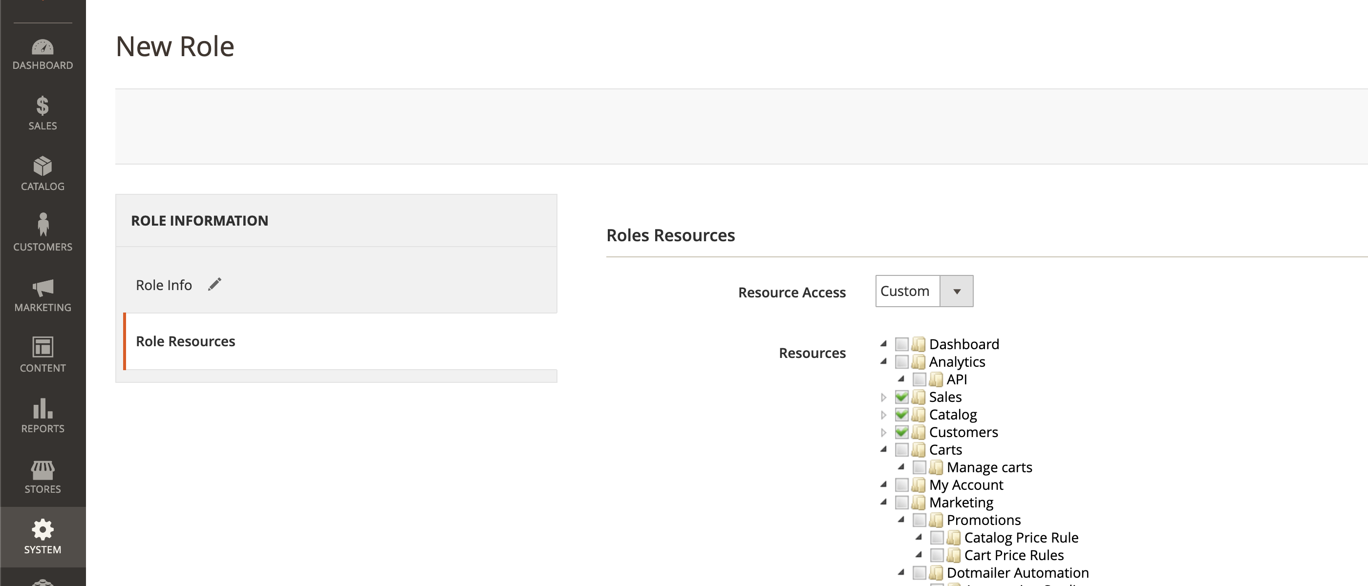- W tym miejscu możesz utworzyć nową Rolę użytkownika - System -> (Permissions) User Roles - definiując konkretne zasoby do których integracja będzie miała dostęp. Oprócz niezbędnego dostępu do interfejsu API, będą to zasoby synchronizowane z Baselinkerem, jak na przykład zamówienia, produkty, kategorie czy klienci.