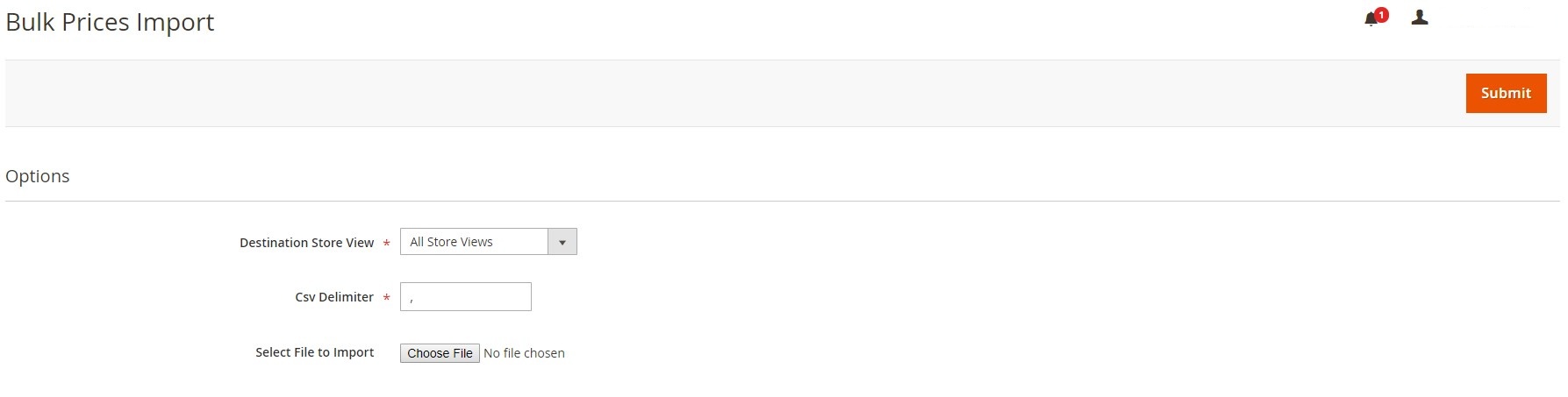 Jeśli chodzi o funkcjonalność importowania w rozszerzeniu, dodaje ono oddzielny interfejs do Panelu admina magento, gdzie możesz przesłać plik z nowymi cenami produktów do masowej aktualizacji. Ustawienia importu cen hurtowych pozwalają administratorom wybrać witrynę docelową, wprowadzić separator CSV i wybrać plik do importu.