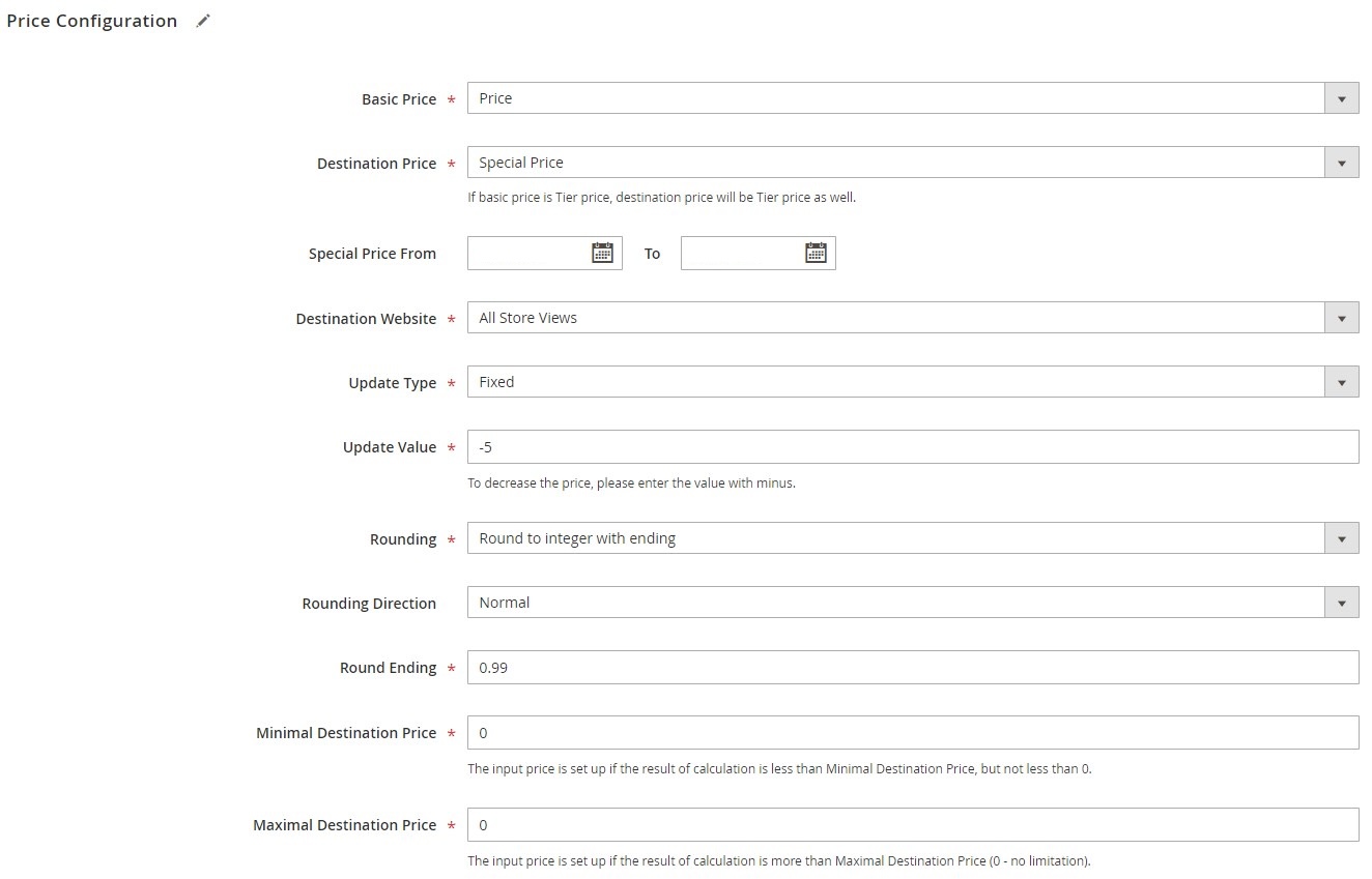 Aby skonfigurować rozszerzenie Magento 2 Bulk Prices Updater, najpierw wybierz podstawową cenę produktu, którą chcesz zmienić. Możesz wybrać jedną z następujących opcji: Cena, Cena specjalna, Koszt, Cena hurtowa lub Zalecana cena detaliczna producenta. Następnie zdecyduj, do której grupy cenowej przypisać zaktualizowaną cenę (cena, cena specjalna, koszt lub zalecana cena detaliczna producenta), ustaw okres, w którym nowa cena zostanie aktywowana (działa tylko dla opcji cena specjalna) i wybierz widok sklepu. Pole Typ aktualizacji oferuje dwie opcje: Stała i Procentowa. Następnie określ wartość zwiększenia/zmniejszenia ceny i wybierz rodzaj zaokrąglenia ceny (bez zaokrąglania, zaokrągl do liczby całkowitej, zaokrągl do liczby całkowitej z końcówką lub zaokrągl końcówkę do progu). Będziesz musiał również ustawić kierunek zaokrąglania dla cen zaokrąglonych do liczby całkowitej oraz określić końcówkę zaokrąglania dla ostatnich dwóch opcji. Tutaj można również podać wartości minimalnej i maksymalnej dla cen docelowych.