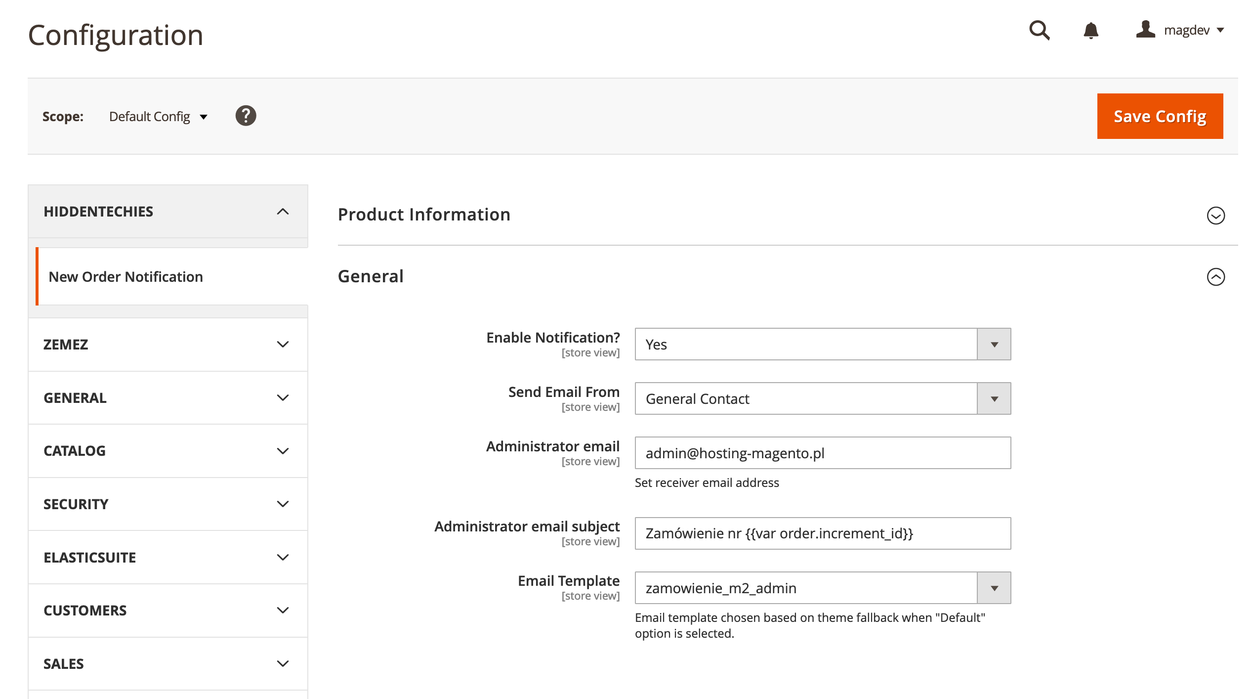 W panelu admina magento przechodzimy do: Stores -> Configuration -> Hiddentechies -> New Order Notification