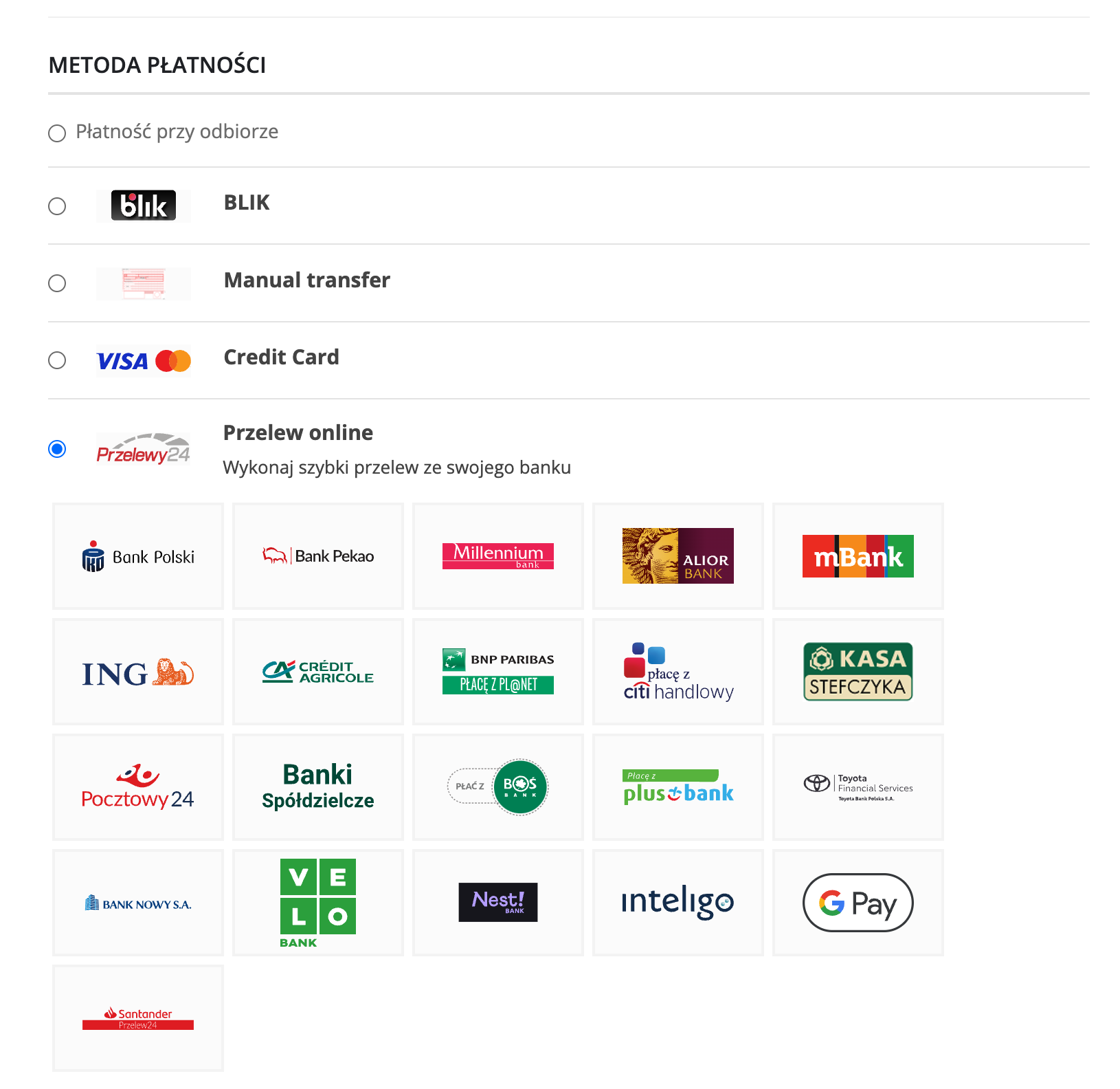Po uzupełnieniu konfiguracji, zapisie danych i odświeżeniu cache magento, na frontend sklepu pojawi się nowa metoda płatności Przelewy24, wraz z określonymi sposobami płatności.