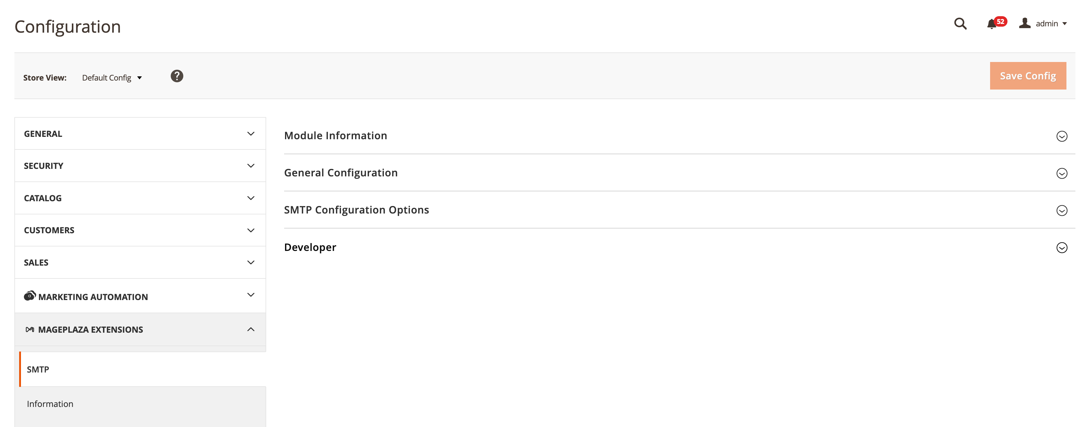 W panelu admina magento przechodzimy do: Stores -> Configuration -> Mageplaza Extensions -> SMTP